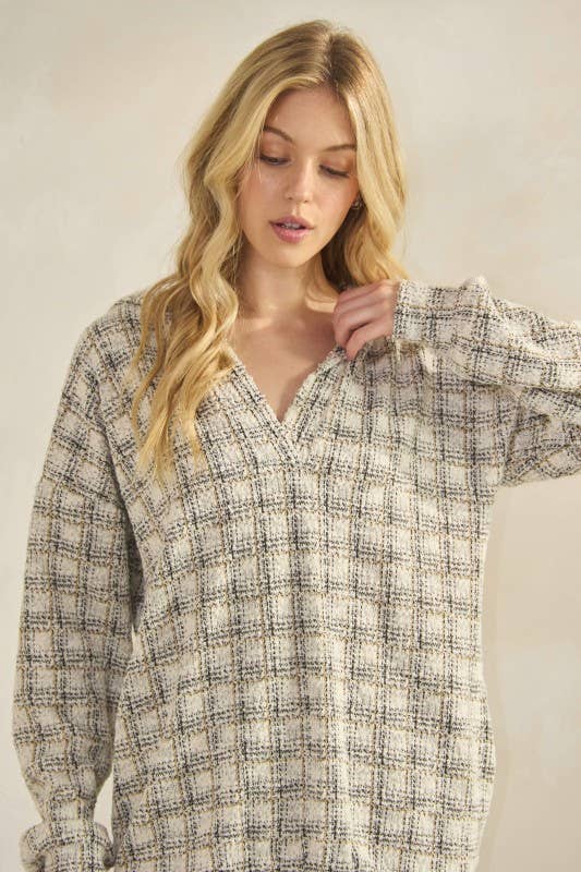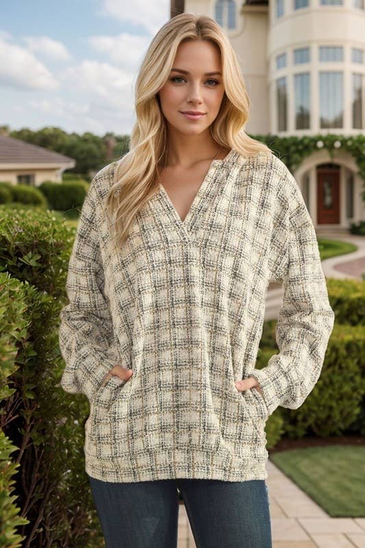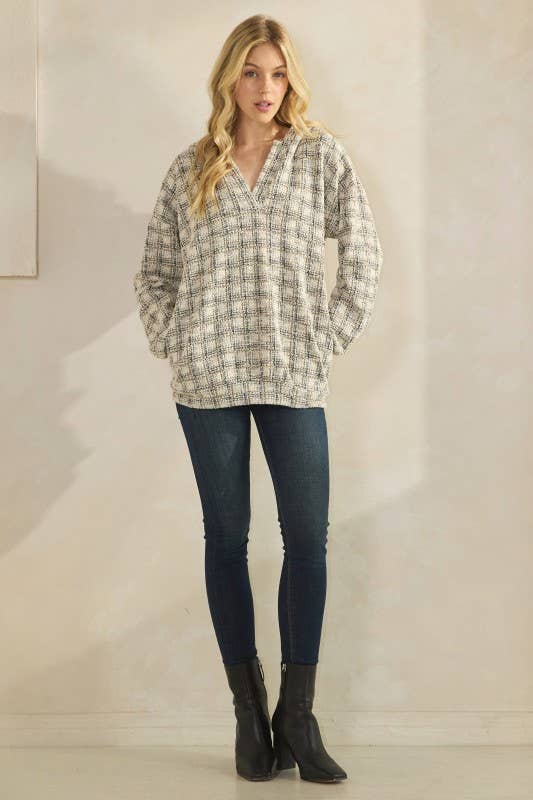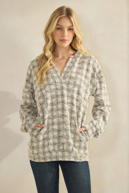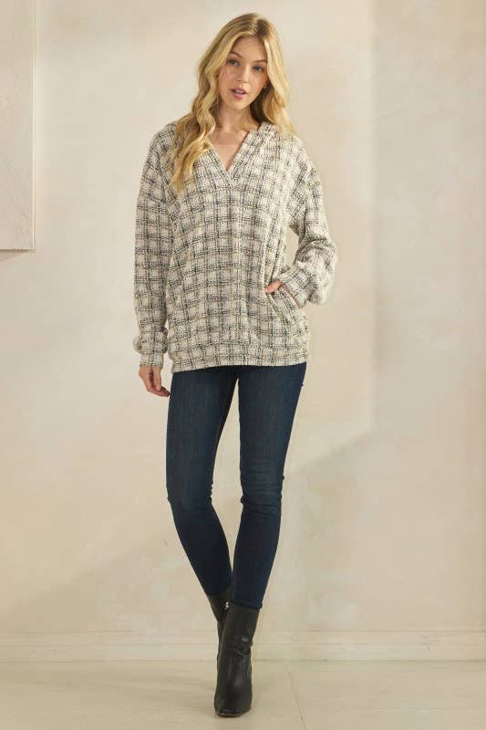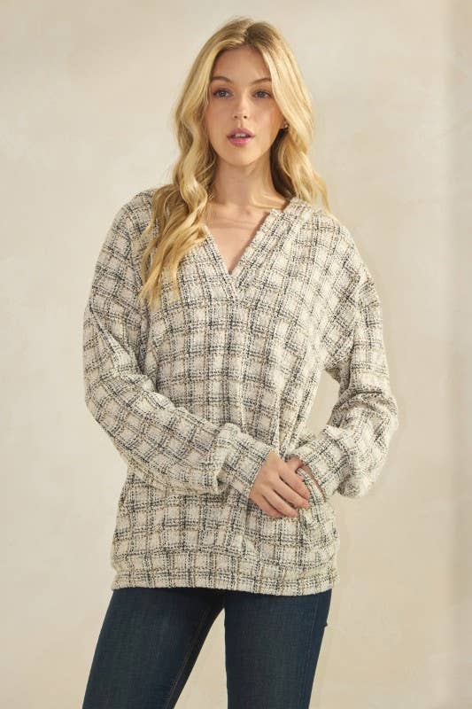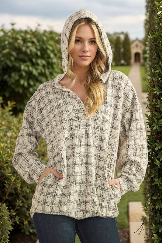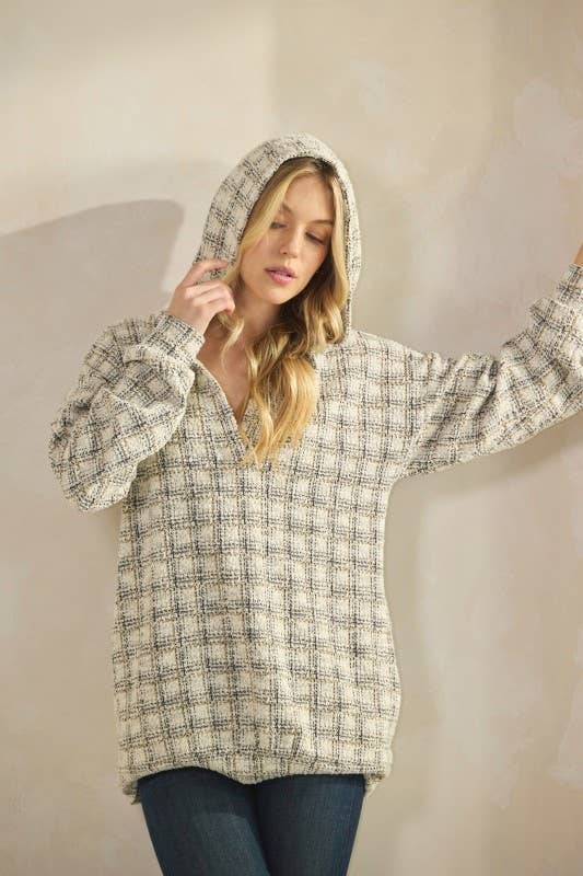 95% POLYESTER 5% SPANDEX LONG SLEEVE CHECKER BOUCLE FABRIC HOODIE TOP