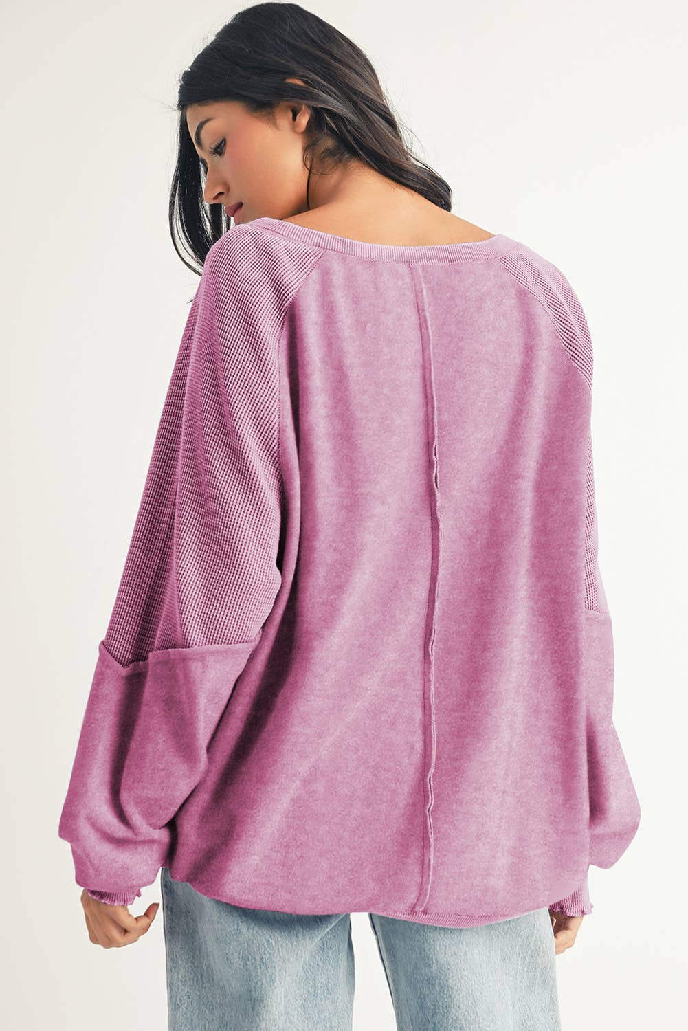 Waffle knit texture Exposed seamsRaglan sleeves designTexture change halfway along sleeve with exposed seamPullover top sweater sweatshirtRibbed crewneckBaggy sleeves with cuffled hemMineral Wash finishFabric: 100% PolyCare: Machine wash cold